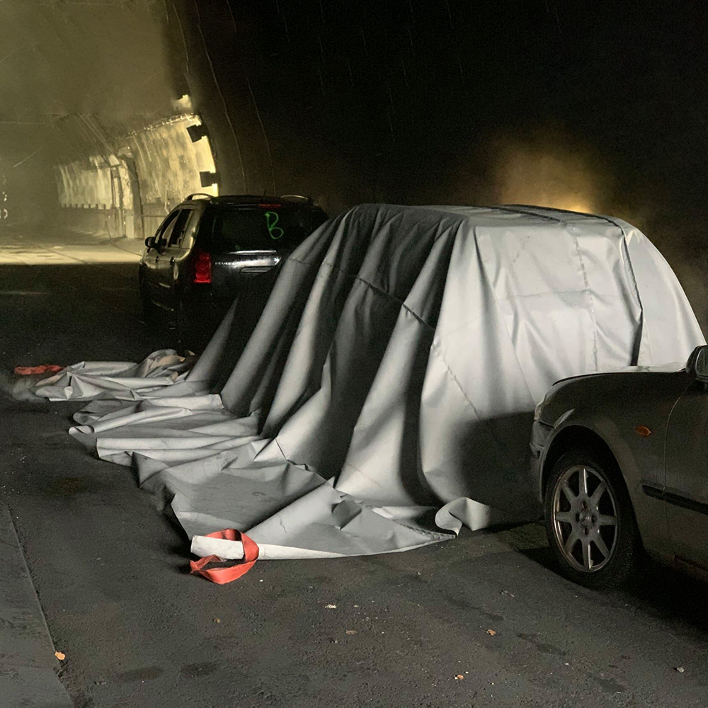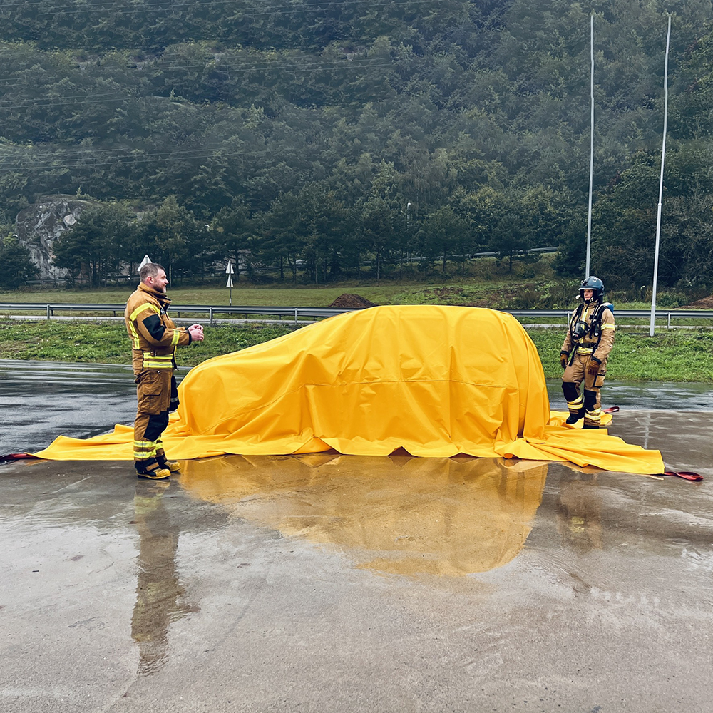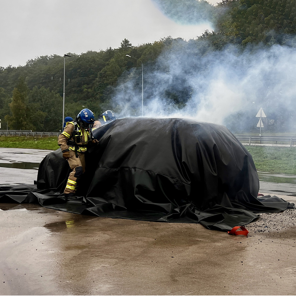 A car fire blanket from HABITA can be quickly pulled over the vehicle, stifling the flames and reducing the likelihood of the fire really taking hold and spreading to neighbouring cars. Not only does it stop the fire but it also contains the toxic fumes that can escape an electric vehicle fire.