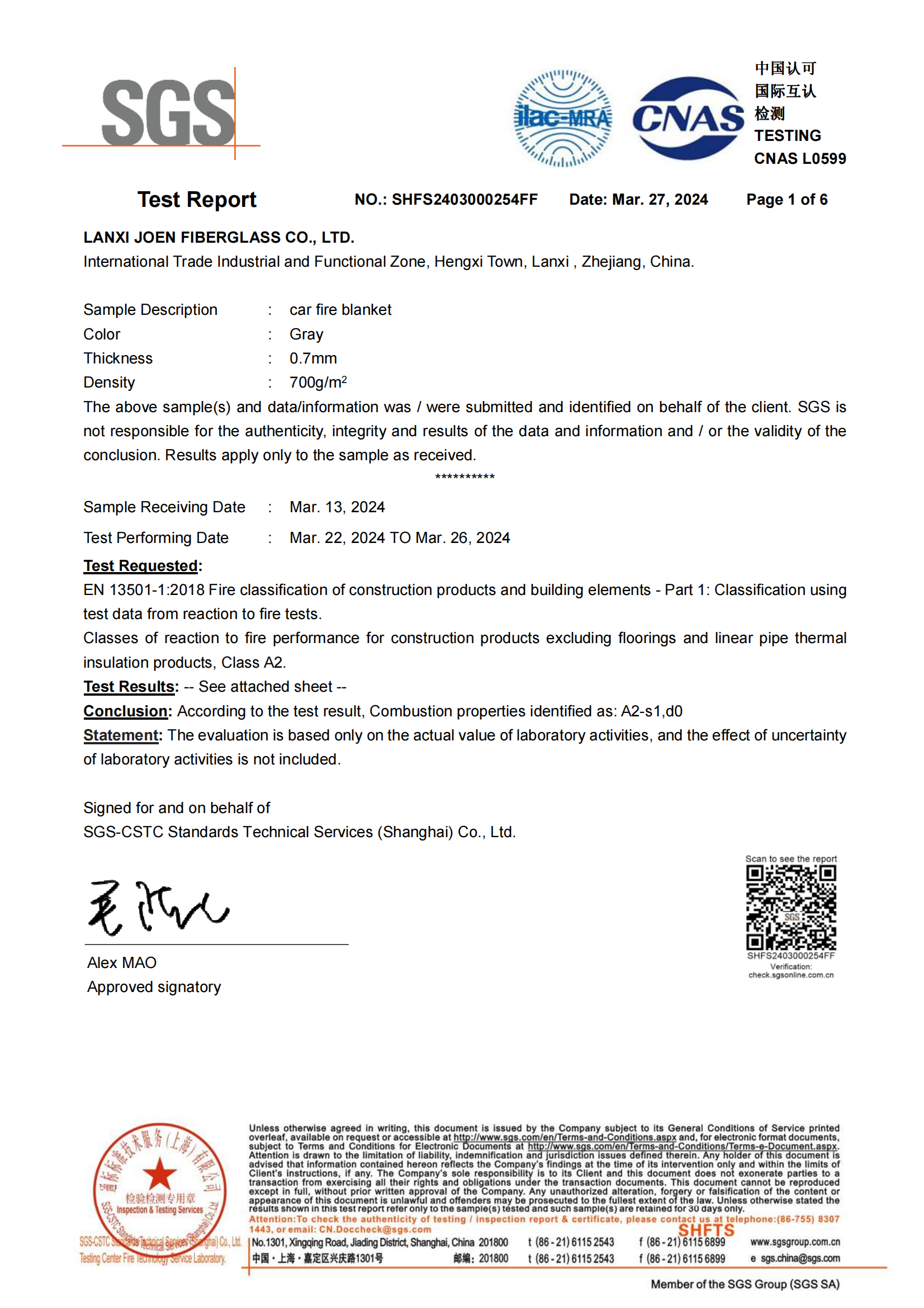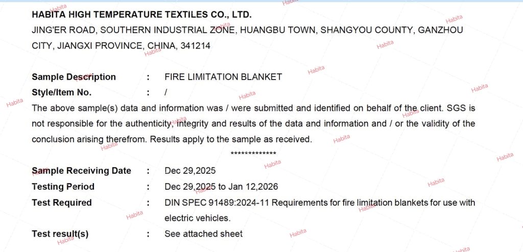Currently,Habita High Temperature Textiles Co., Ltd. Fire Limitation Blankets Pass DIN SPEC 91489:2024 Certification with Excellent Flame Retardancy.